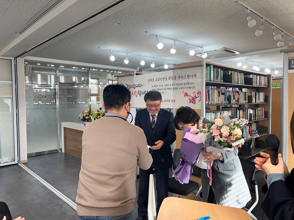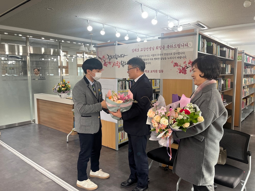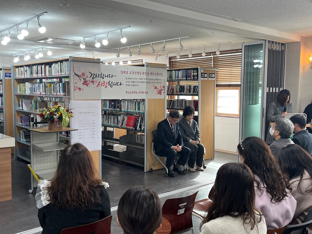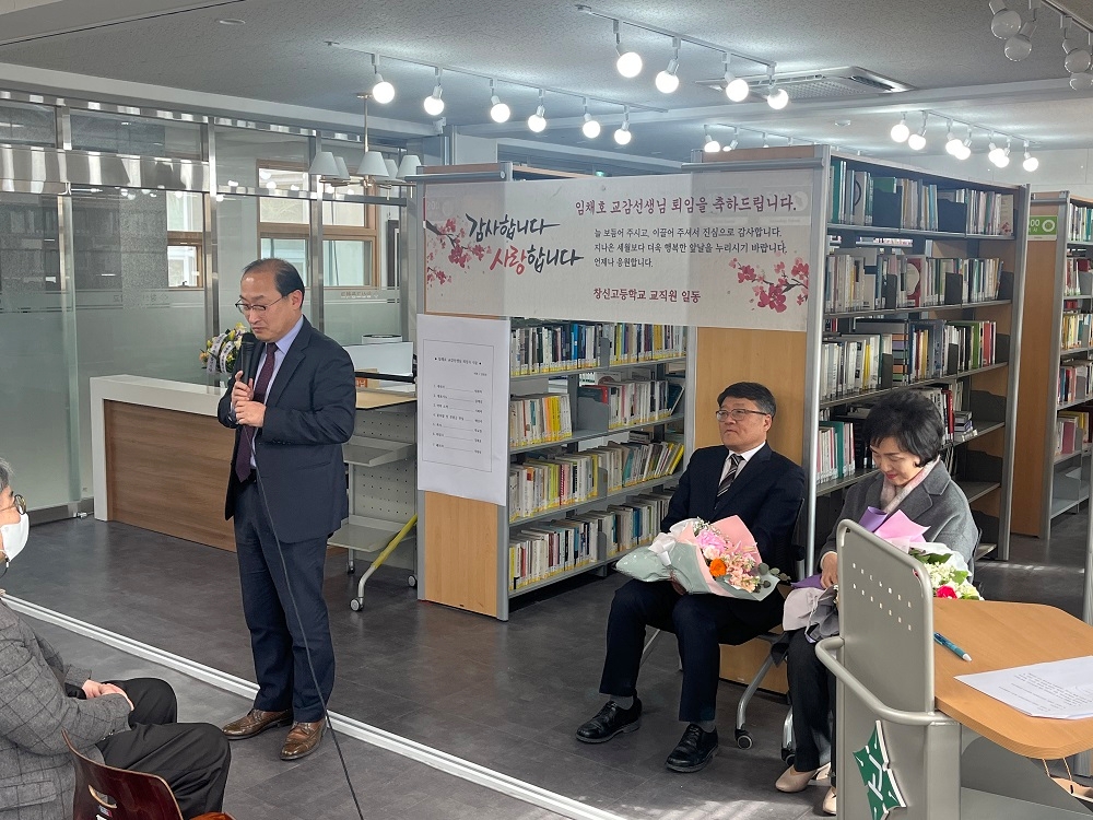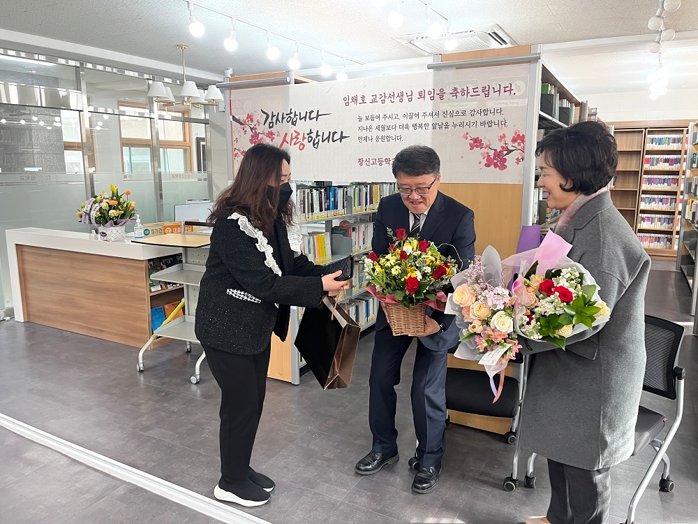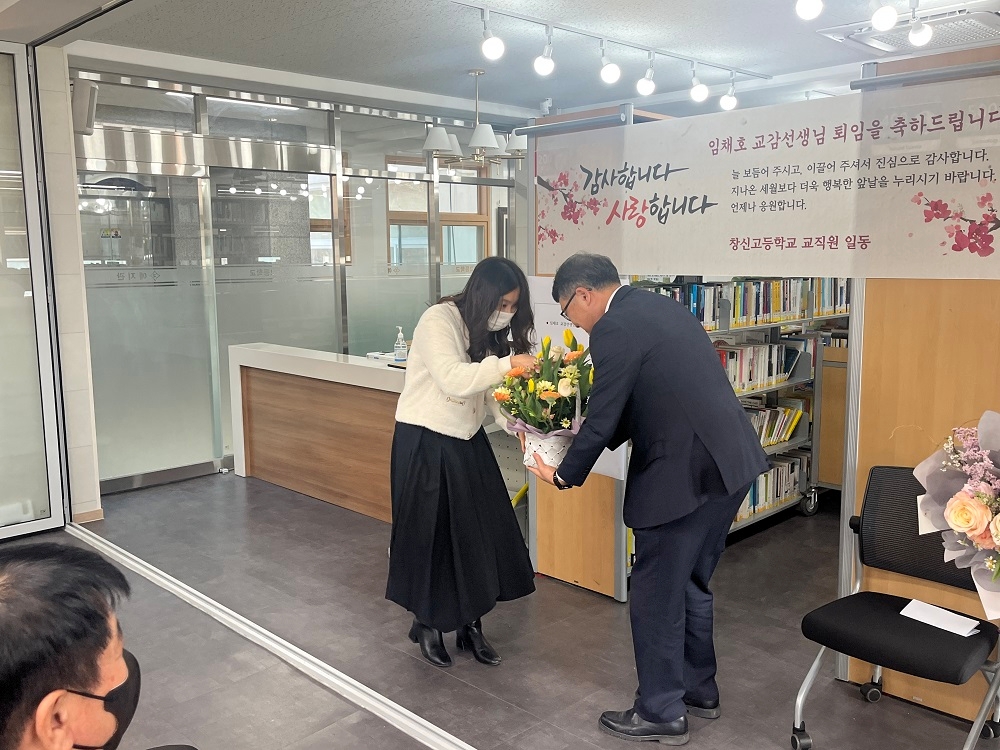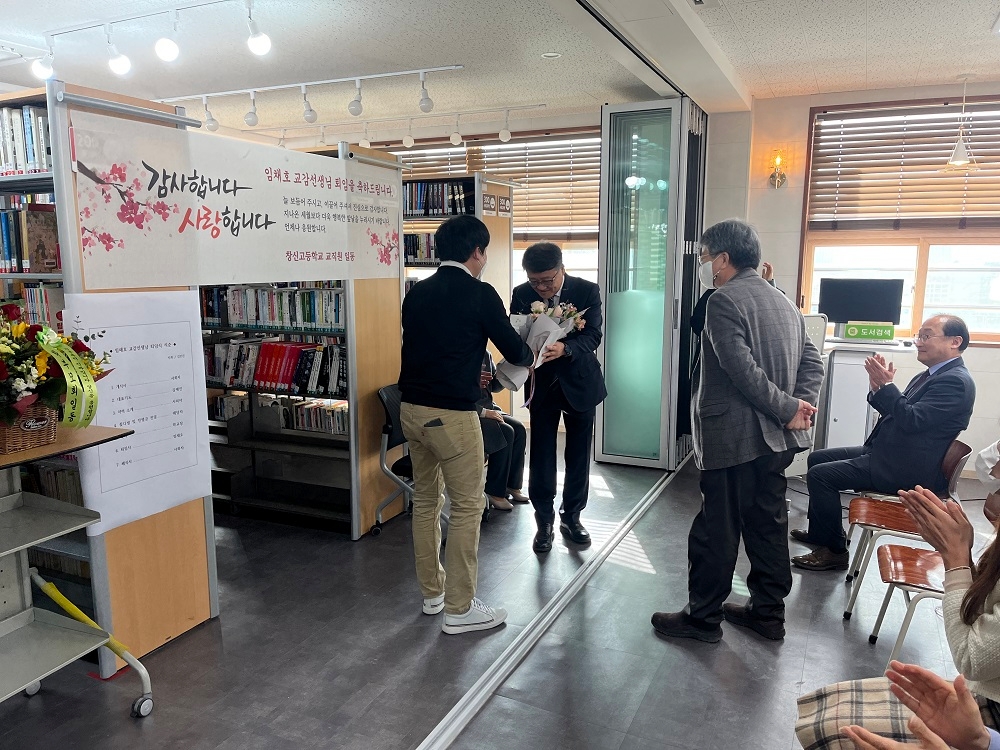 2023.2.10.(금) 본교에서 34년간 재직하신 '임채호 교감선생님 퇴임식'이 진행되었습니다. 교감선생님의 퇴임식에 교감선생님의 사모님과 학부모님, 학생이 참석하여 교감선생님의 공로에 감사하고, 퇴직을 축하하는 의미있는 행사를 진행했습니다. 교감선생님께서는 지난 34년 동안 창신고등학교에서 한결같이 열정을 다하여 학생들을 지도하셨으며 근면 성실하고 헌신적인 모습으로 주위 선생님께 많은 귀감이 되어주셨습니다. 이에 창신고등학교 전 교직원이 감사함을 전합니다.