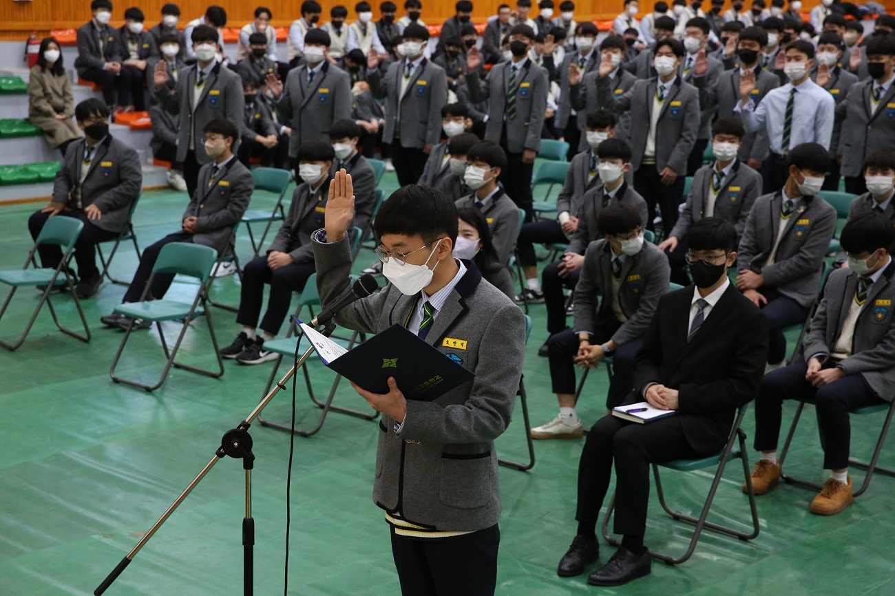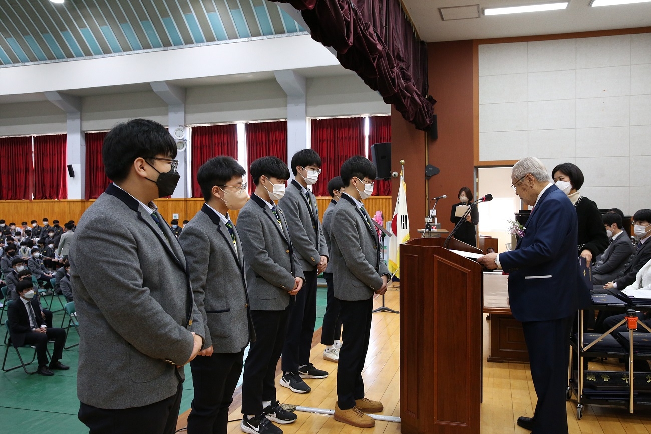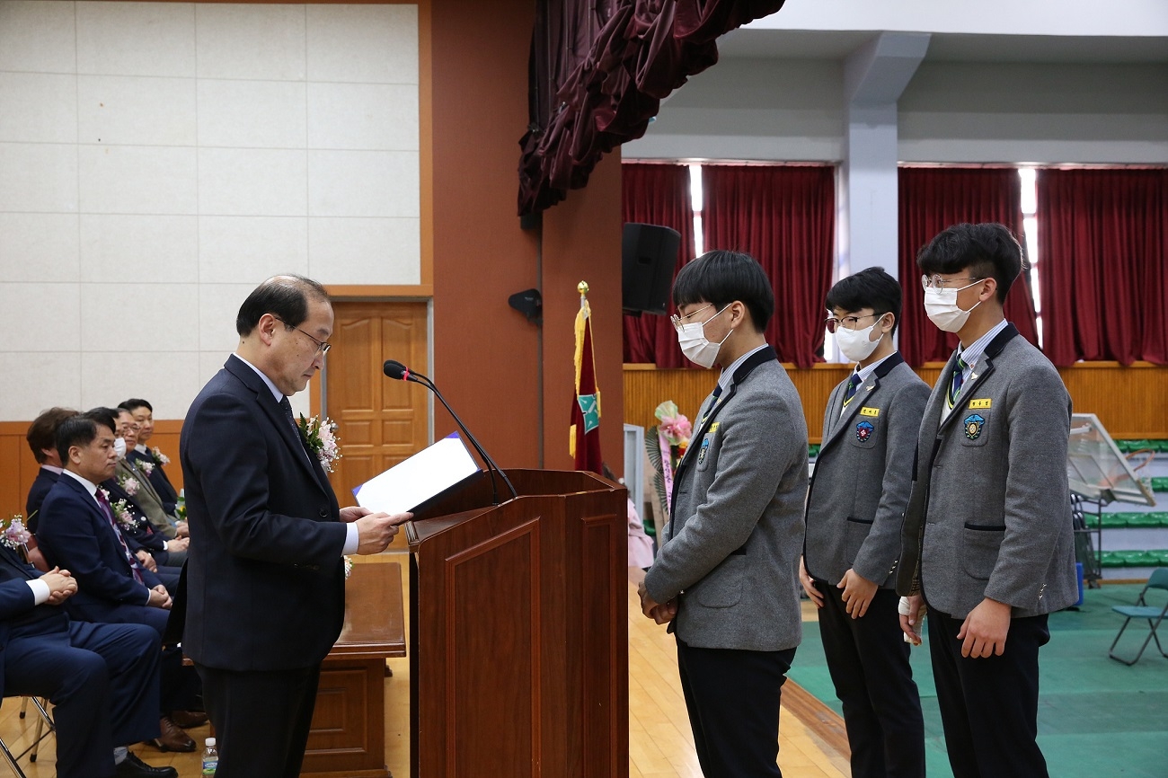 신입생을 맞이하는 이상진 교장선생님의 환영사와 강병도 학원장님의 격려사, 조갑제 총동문회장님의 축사가 있었습니다. 이어 밀양별빛교회 김태군 목사님의 특송으로 입학식을 빛내주셨습니다.