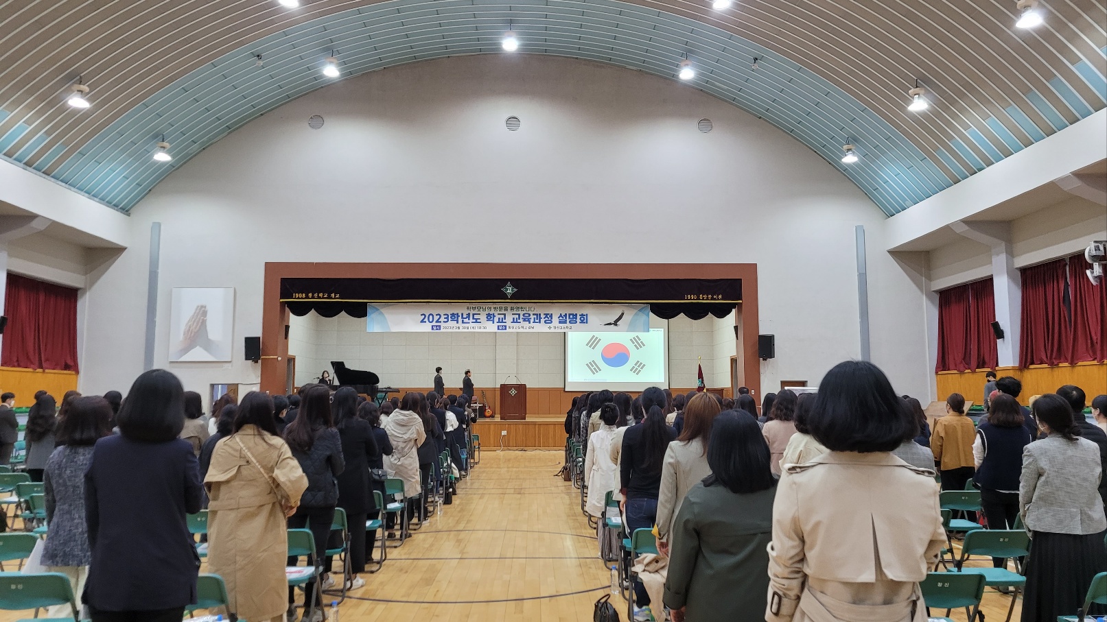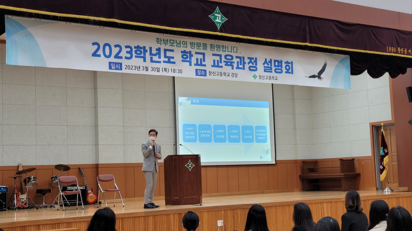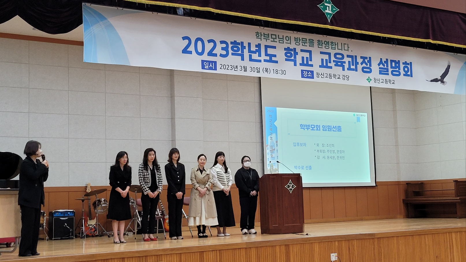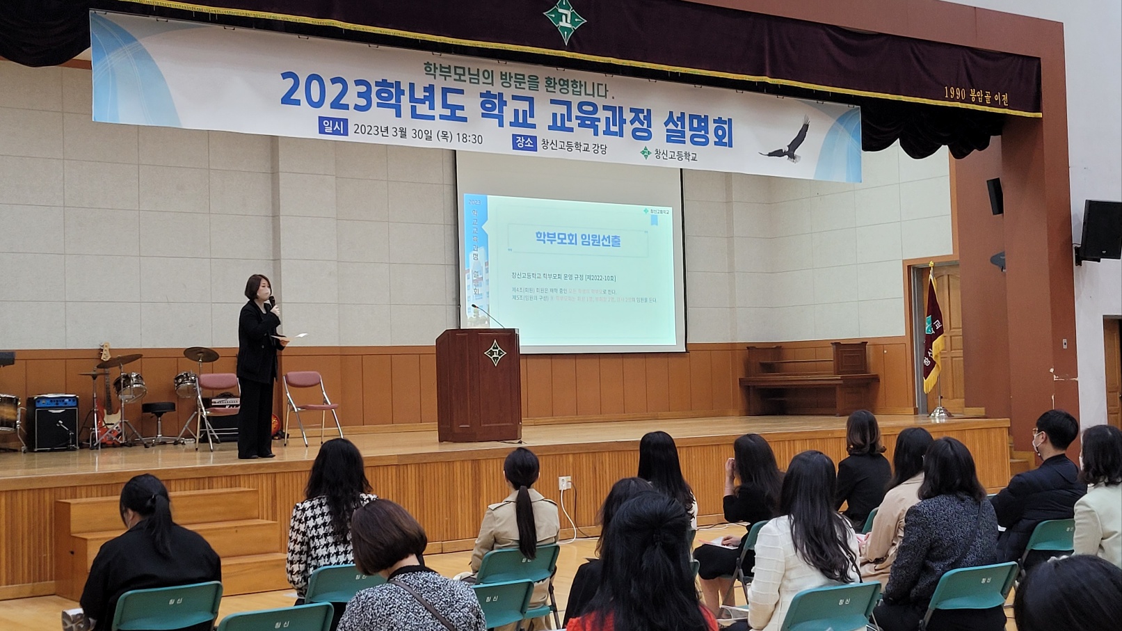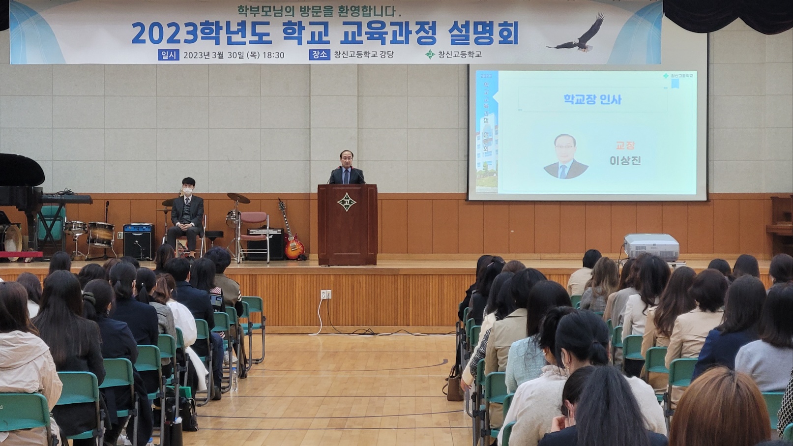 신학기를 맞이하여 2023년 3월 30일(목) 창신고등학교 강당에서 ‘학교 교육과정 설명회’를 개최하였습니다. 220여명의 학부모님들이 참석하셔서 자리를 빛내 주셨습니다. 설명회에서는 주요 학사일정 및 특색활동 안내, 3개년 교육과정과 진학정보 안내, 학부모 연수, 학부모 총회를 진행하였습니다.