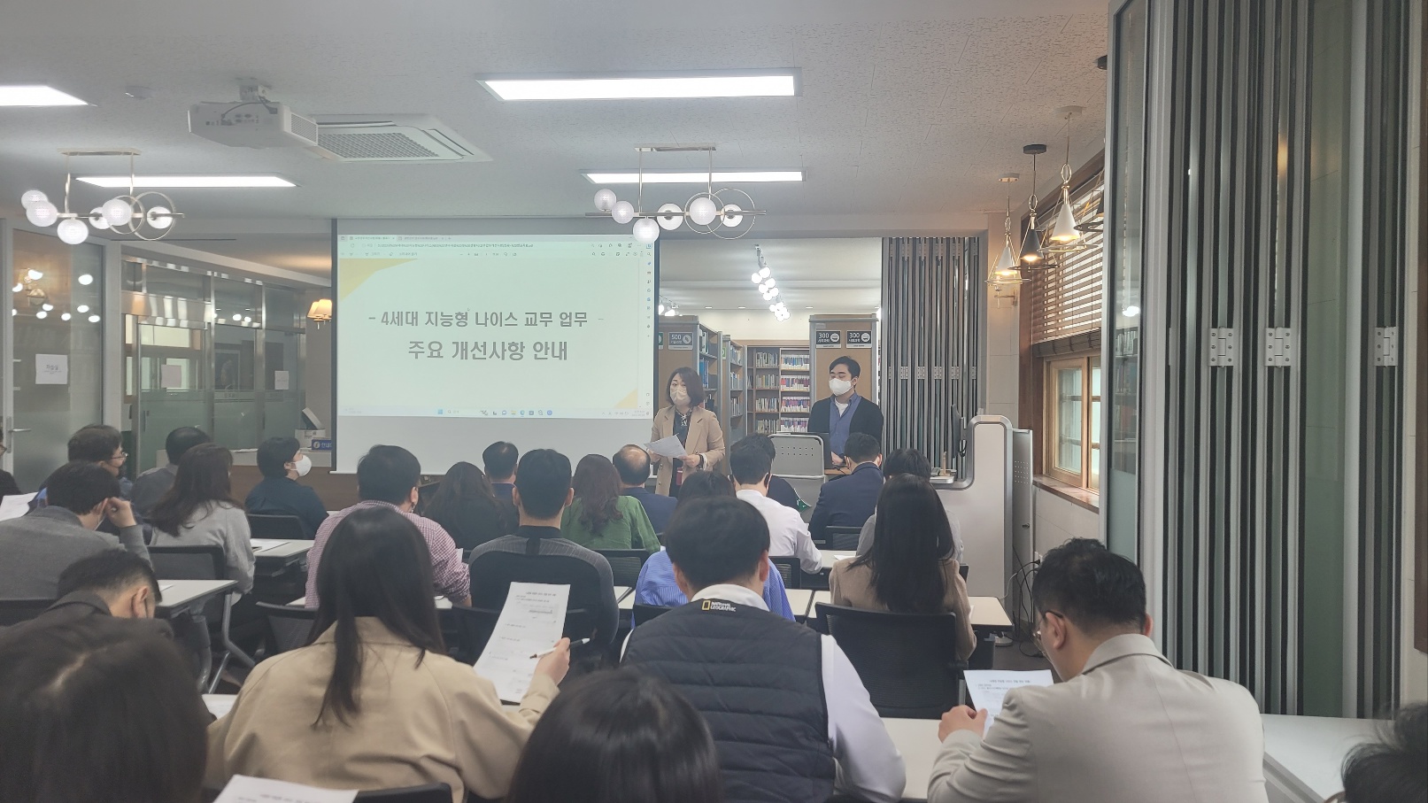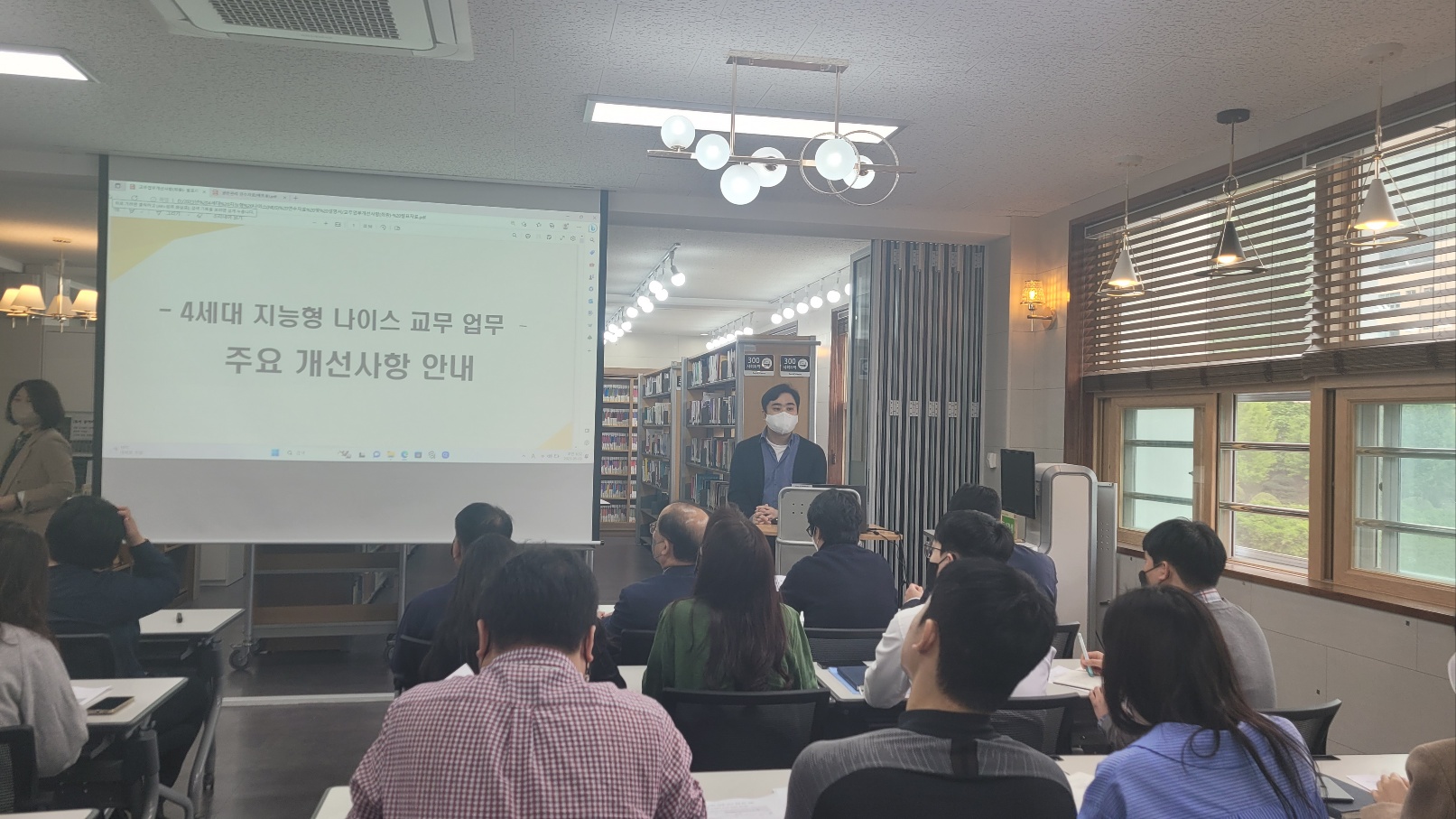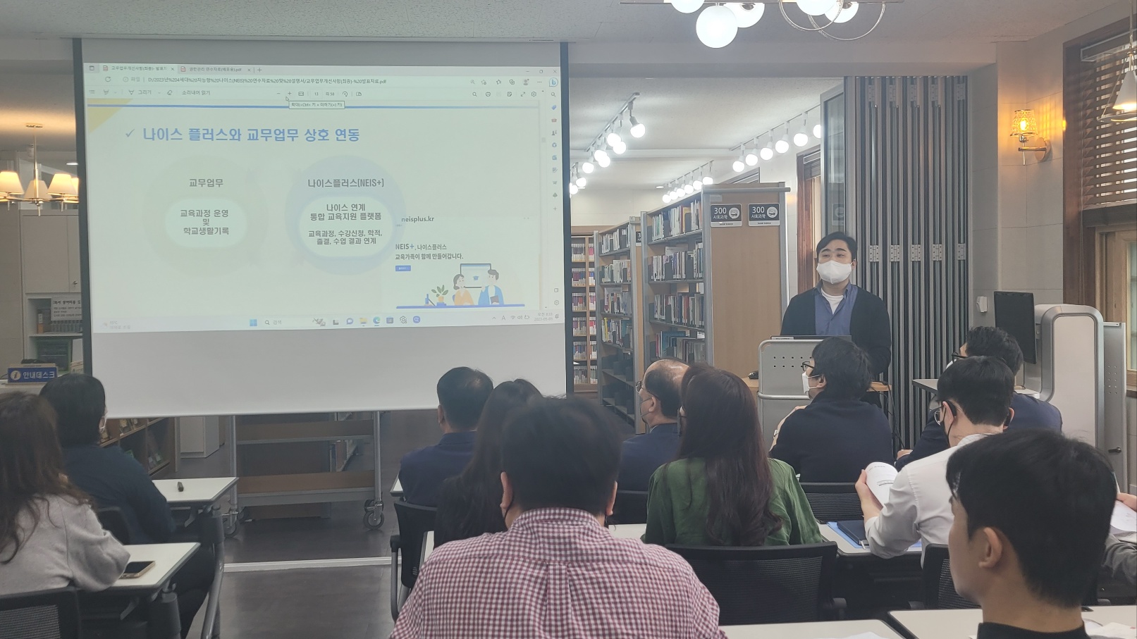 2023년 5월 3일(수) 도서실에서 행정실 포함 전 교직원 제4세대 지능형 나이스 전달 연수가 있었습니다. 연수 내용은 4세대 나이스 사용 설명, 교무업무를 중심으로 주요 개선사항 안내가 있었습니다.