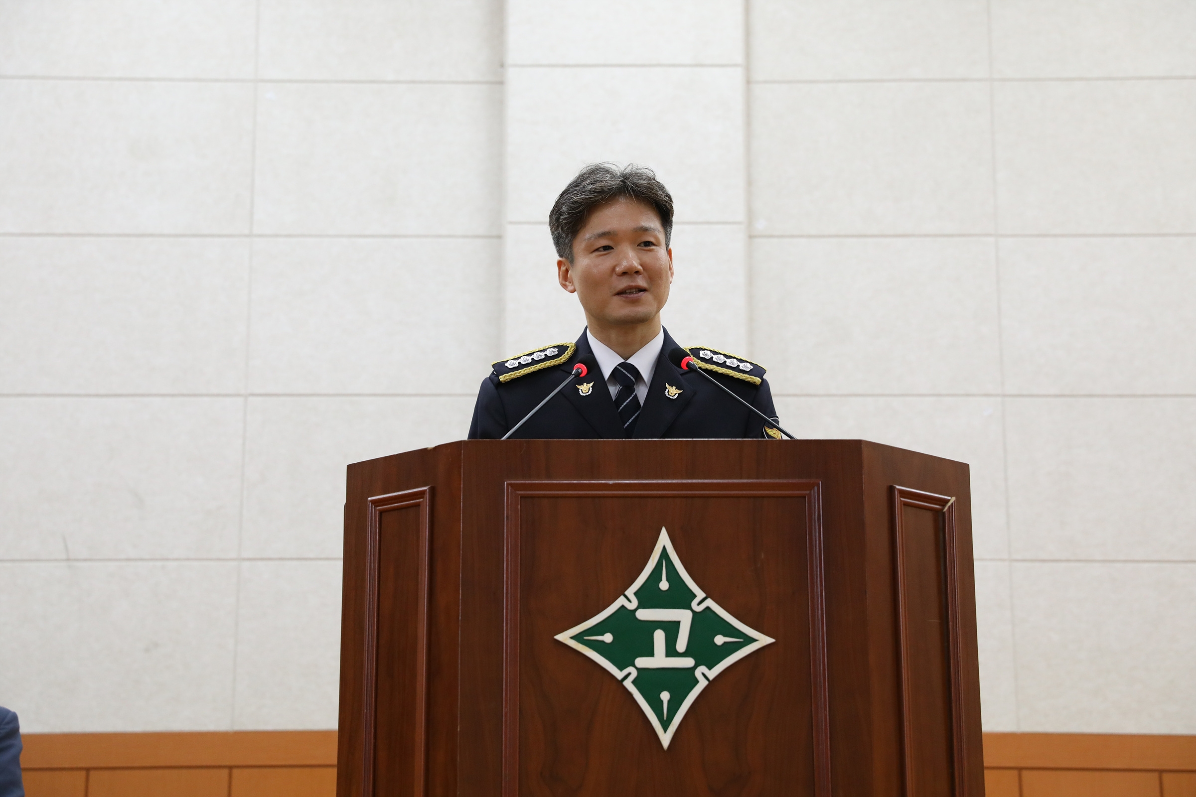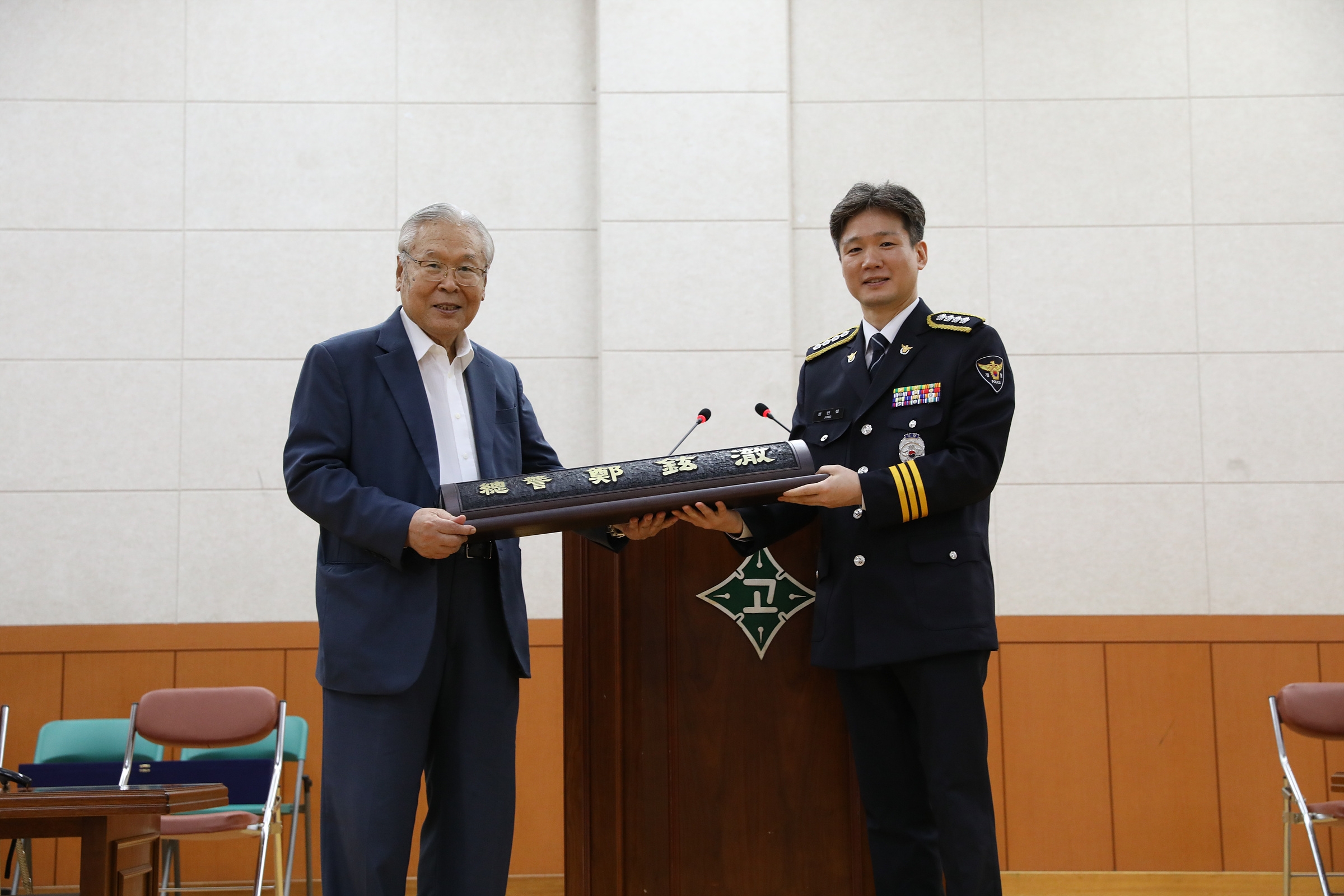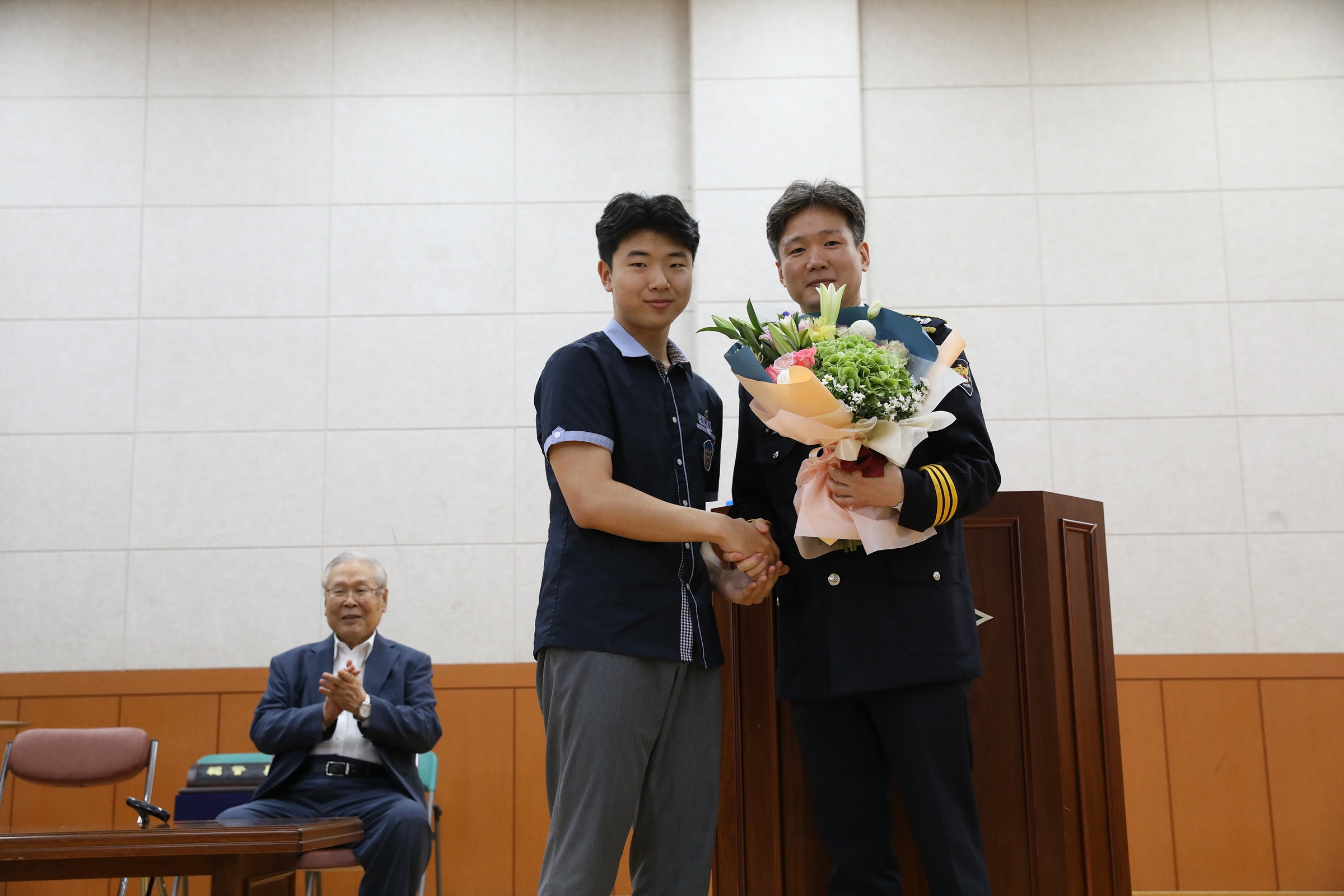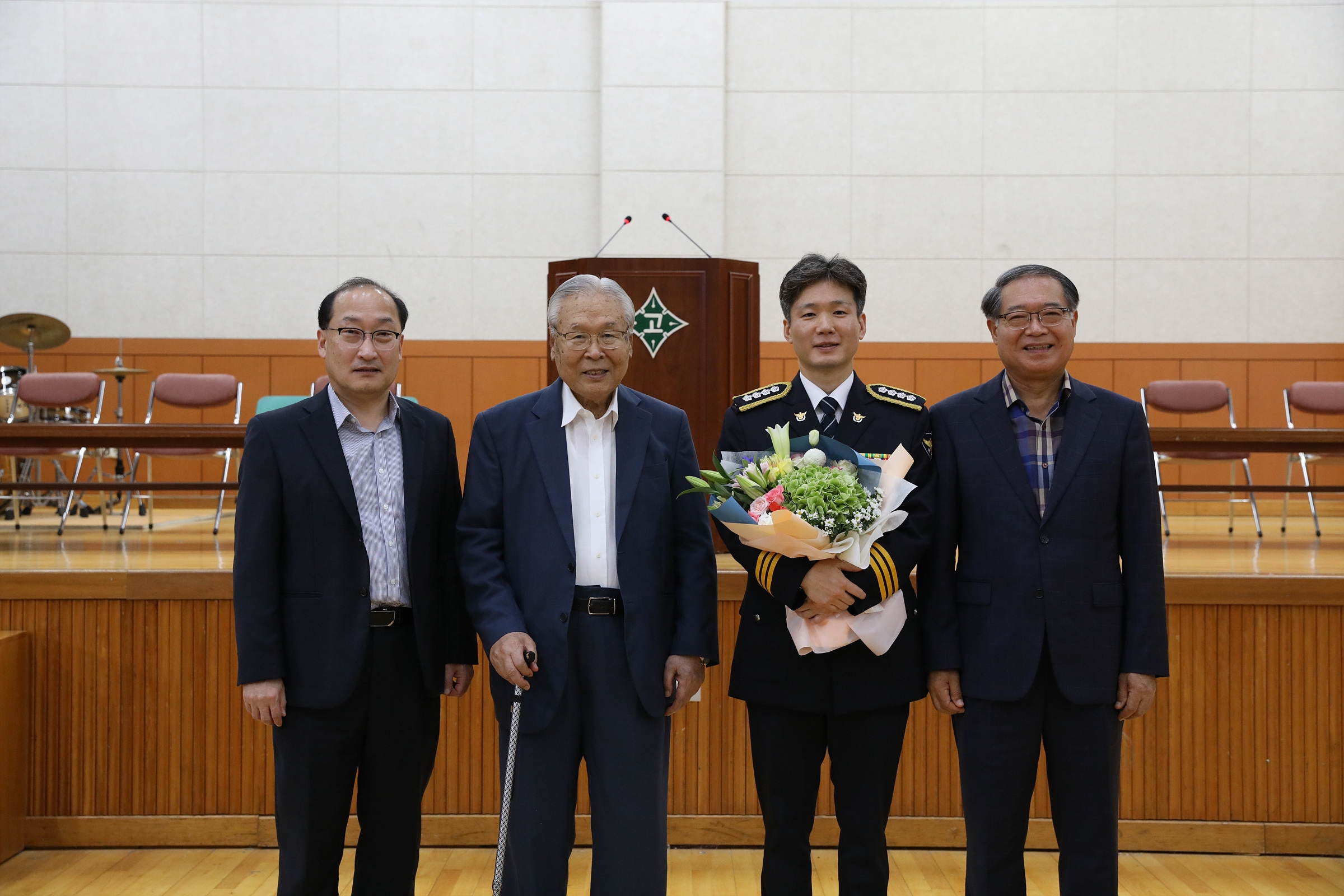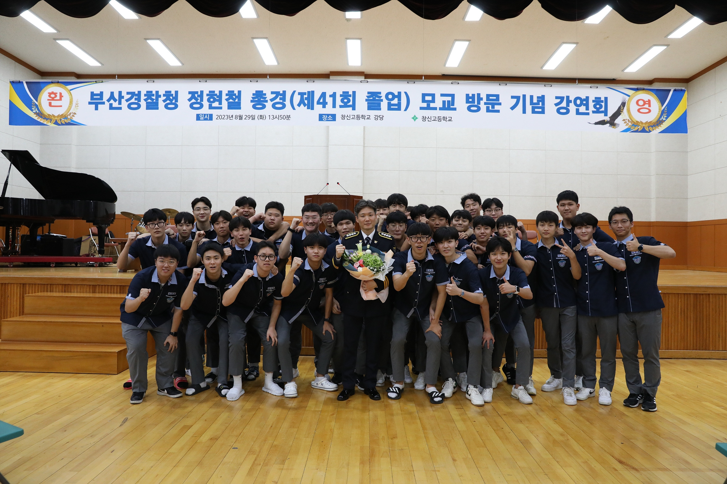 8월 29일(화) 부산경찰청 정현철 총경(제41회 졸업)모교 방문 기념 강연회가 있었습니다. 특강 전 동문의 총경 승진을 축하하기 위해 총동문회에서 마련한‘총경승진 축하 명패 수여식'을 진행하였습니다. 명패수여는 총동문회장님을 대신하여 창신기독학원 학원장님께서 직접 수여하셨습니다. 이어진 강연회에서 학창시절을 통해 반드시 키워야 할 소양이 올바른 가치관과 바른 인성, 진로에 기반한 학업역량임을 특히 강조하셨습니다. 정현철 총경의 동문선배로서, 사회선배로서 전달하는 애정과 염려를 담은 진심 어린 조언에 학생들 모두 자신이 나아가야 할 방향에 대해 깊이 고민하는 뜻깊은 시간이었습니다. 다시 한번 후배들을 위해 모교를 방문해주시고 특강을 진행해주신 총경님께 감사함을 전합니다.