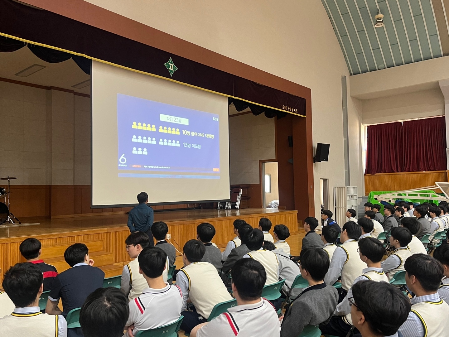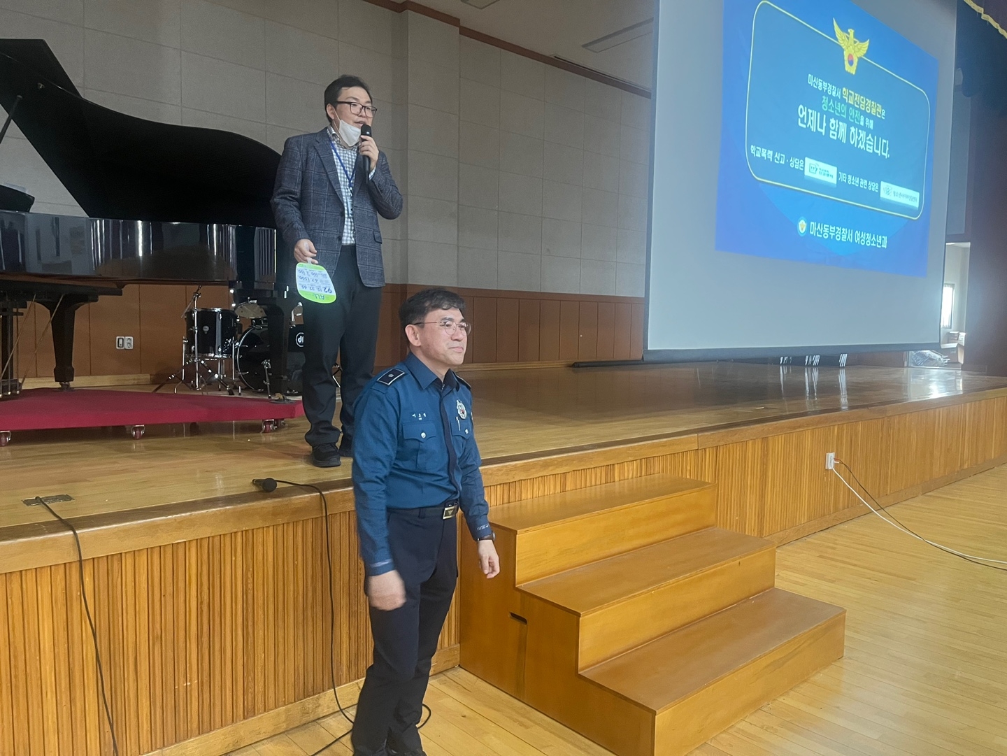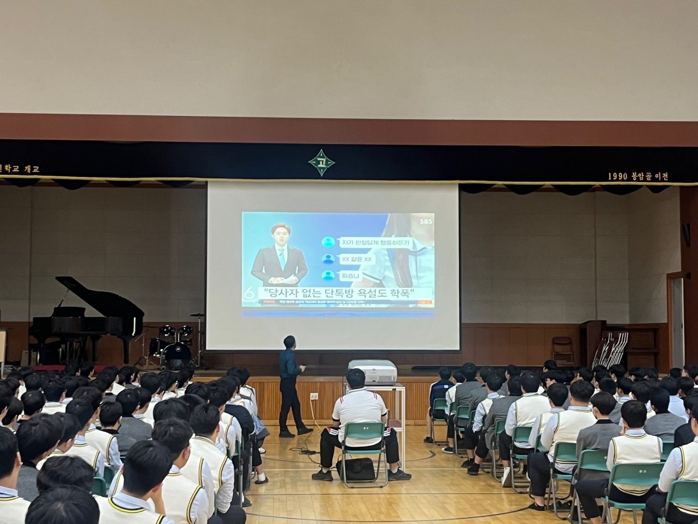 1. 관련 가. 민주시민교육과-2708(2023.3.23.) 나. 2023학년도 학교교육계획 2. 2023학년도 학생 대상 외부 초청 학교폭력 예방 교육을 아래와 같이 실시하였습니다. 가. 일시: 11월 1일(수) 6교시 나. 강사: 마산동부경찰서(학교전담경찰관) 다. 대상: 1, 2학년 라. 방법: 체육관에서 강사 강의 및 영상 시청 마. 내용 1) 학교전담경찰관 소개 및 학교폭력 피해 시 대처요령 2) 학교폭력, 불법카메라 촬영, SNS 유포, 성폭력, 카카오톡 계정갈취 등. 끝.