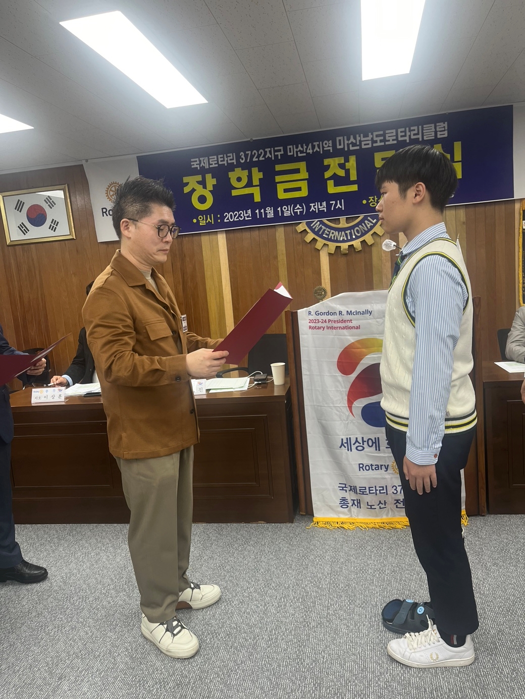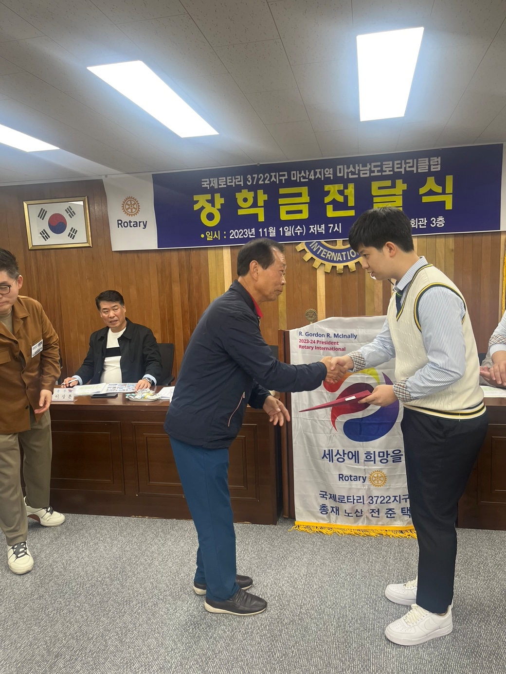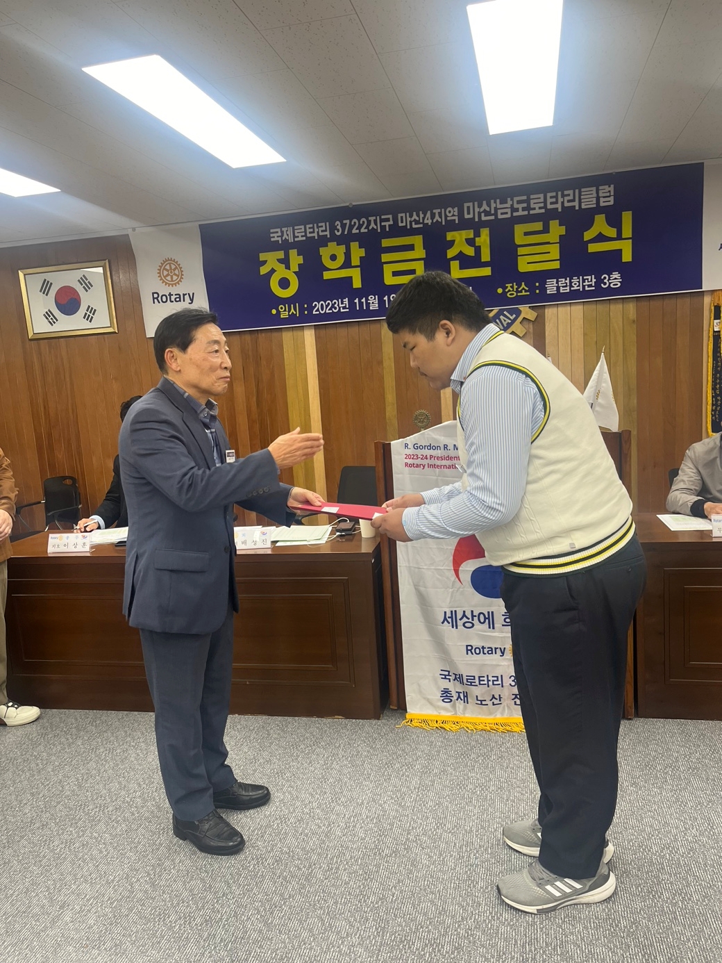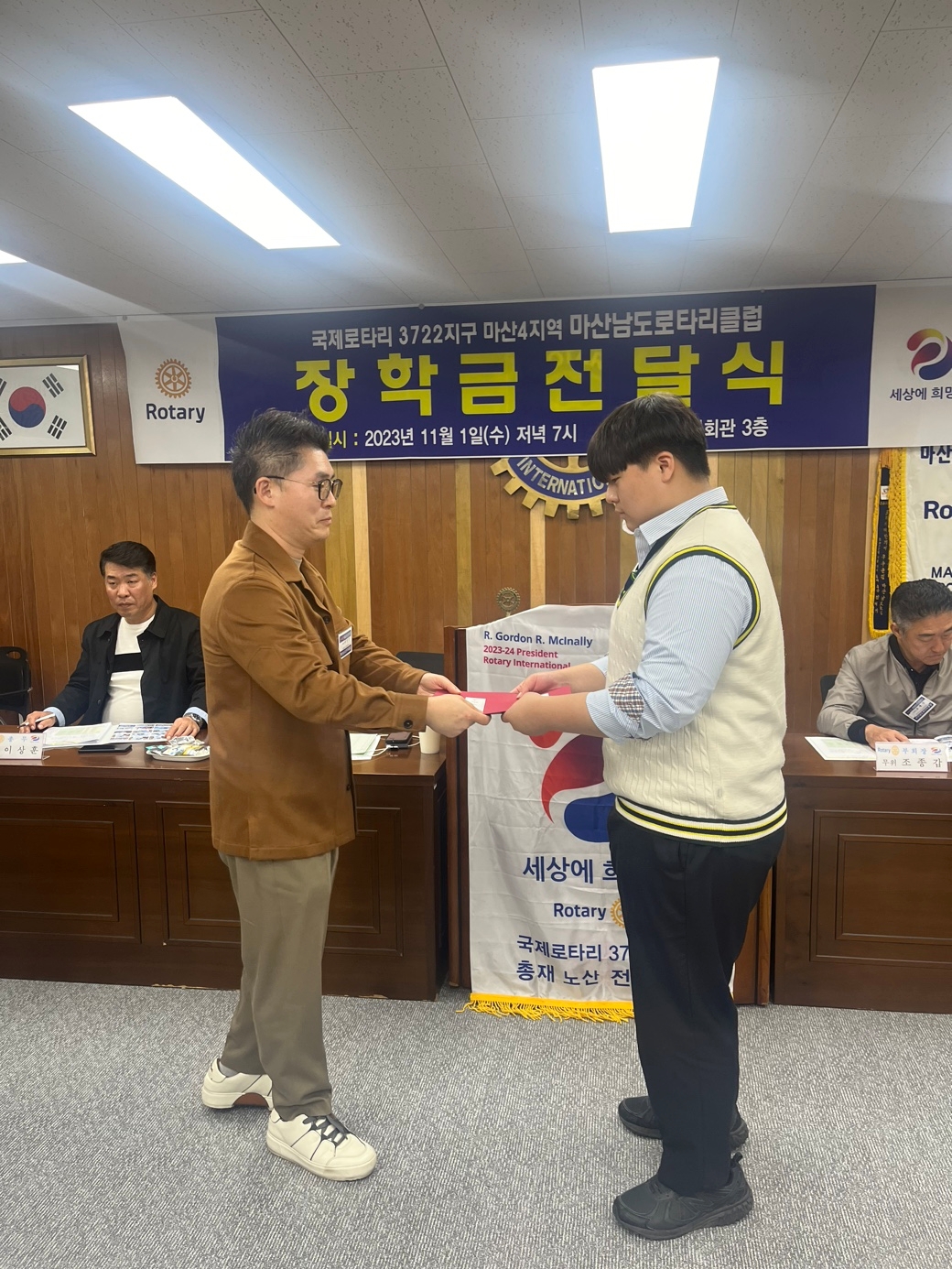1. 일시 : 2023년 11월 1일 수요일 저녁 7시 2. 장소 : 마산 창동 문화빌딩 3층 남도로타리클럽 회의실 3. 대상 : 창신고등학교 인터랙트 소속 학생 4명 4. 수여 금액 : 총 1,300,000원