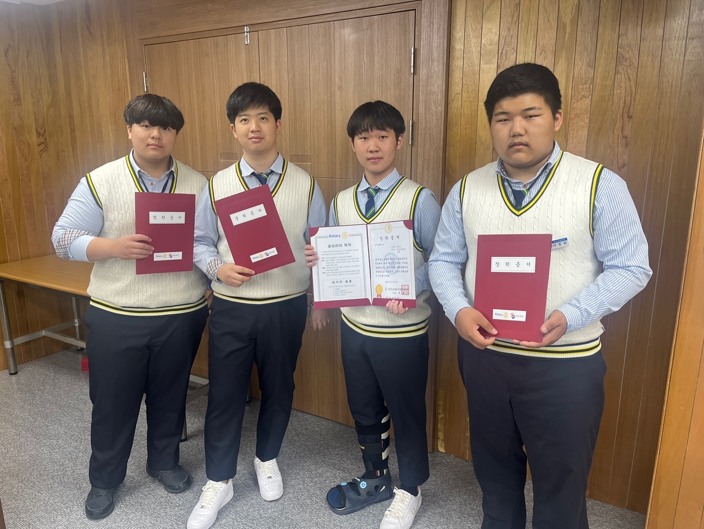 우리 학교의 인터랙트 학생들 중 4명이 마산 남도로타리클럽으로부터 장학증서를 받았습니다.