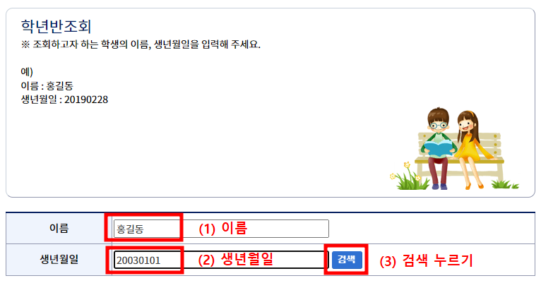 나. 아래 창에 이름과 생년월일을 넣은 후 검색하세요. (예) 이름 : 홍길동, 생년월일 : 20030101